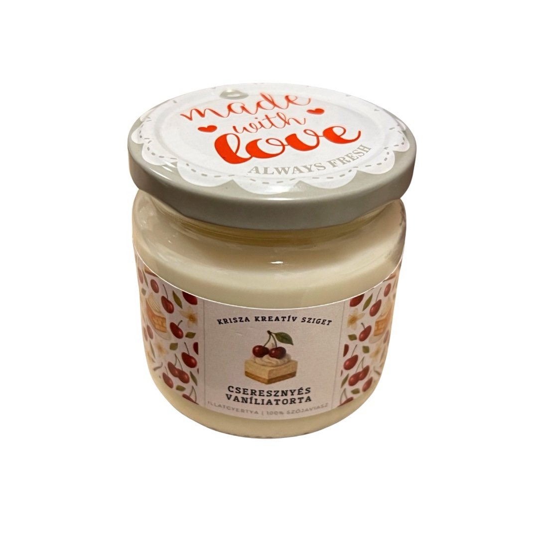Kézzel öntött, természetes szójaviaszból készült illatgyertya, amely a frissen sült vaníliás torta és a lédús cseresznye édes, desszertszerű illatával varázsol meleg, otthonos hangulatot. A krémes vanília és a gyümölcsös cseresznye illatkompozíciója igazán kényeztető, mintha egy szelet friss sütemény illata lengené be a szobát.