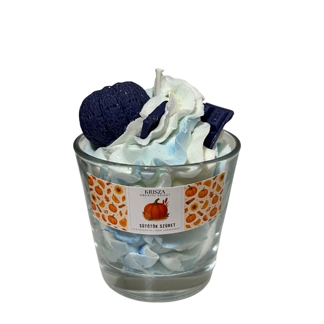 Kézzel öntött, tejszínhab-díszítésű gyertya, amely igazi dekorációs különlegesség is.